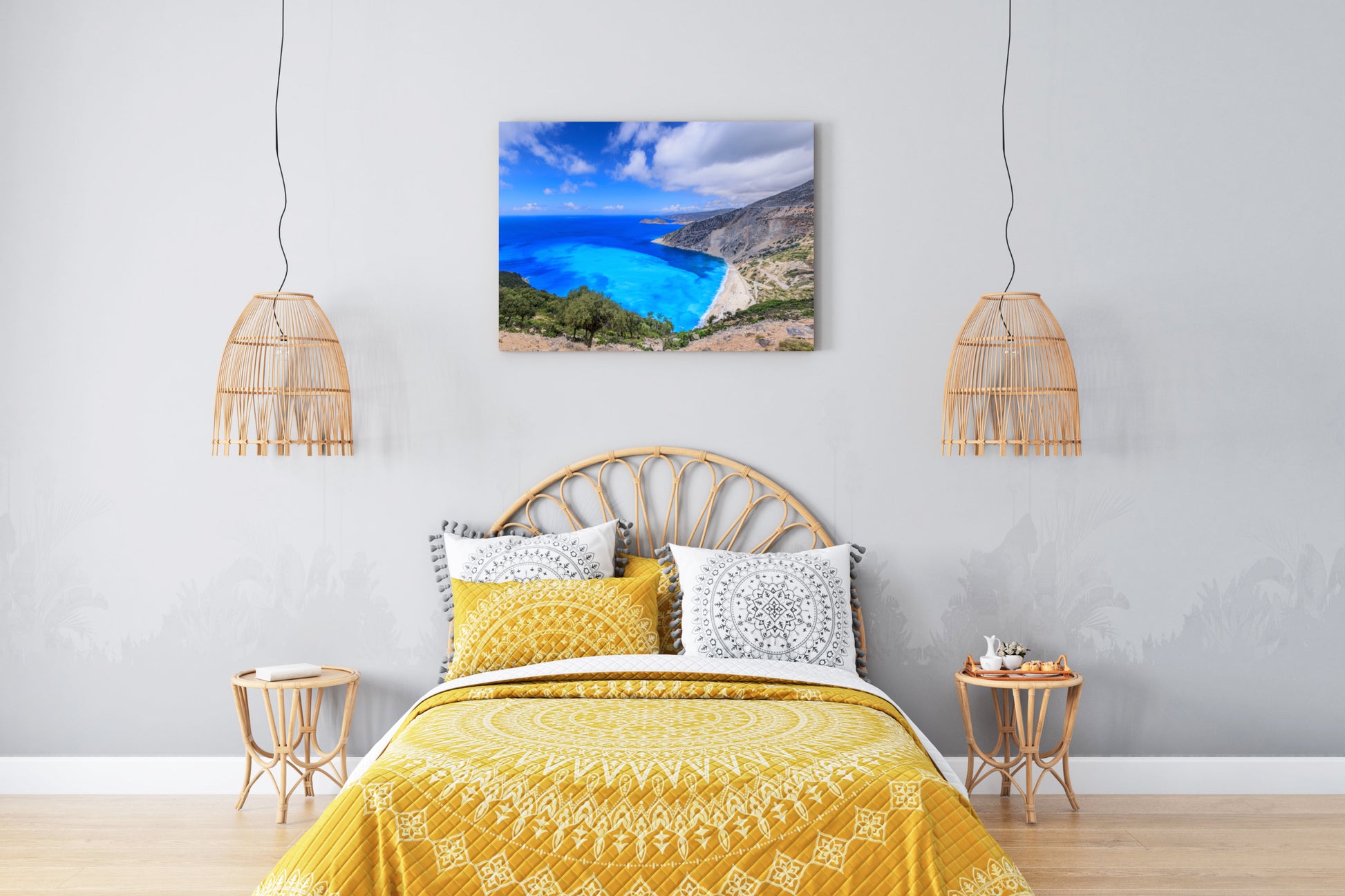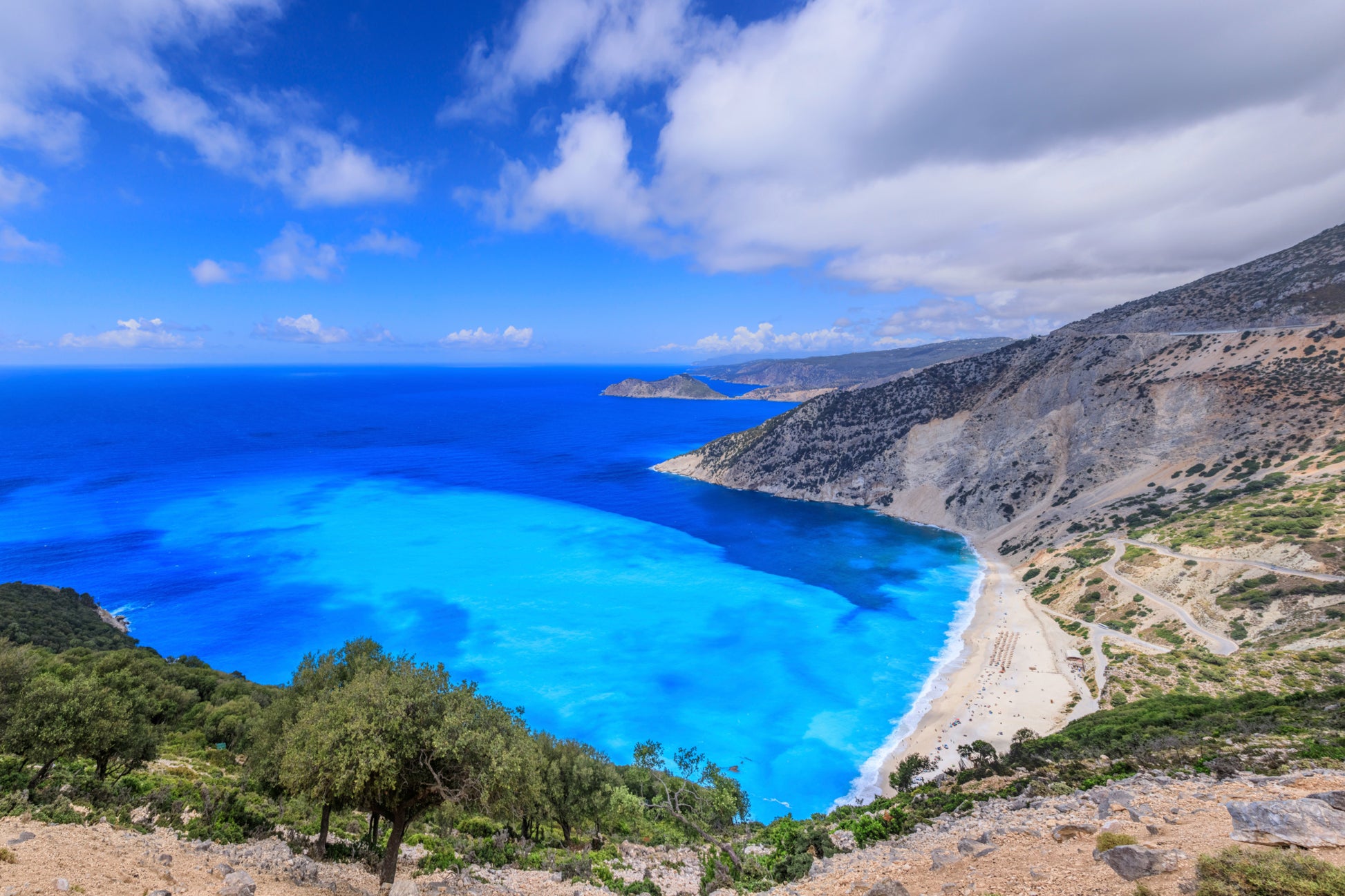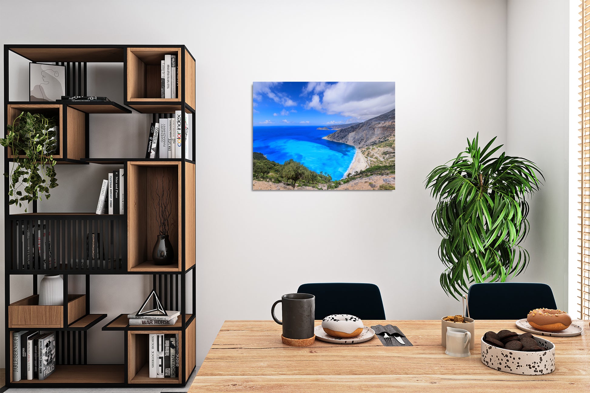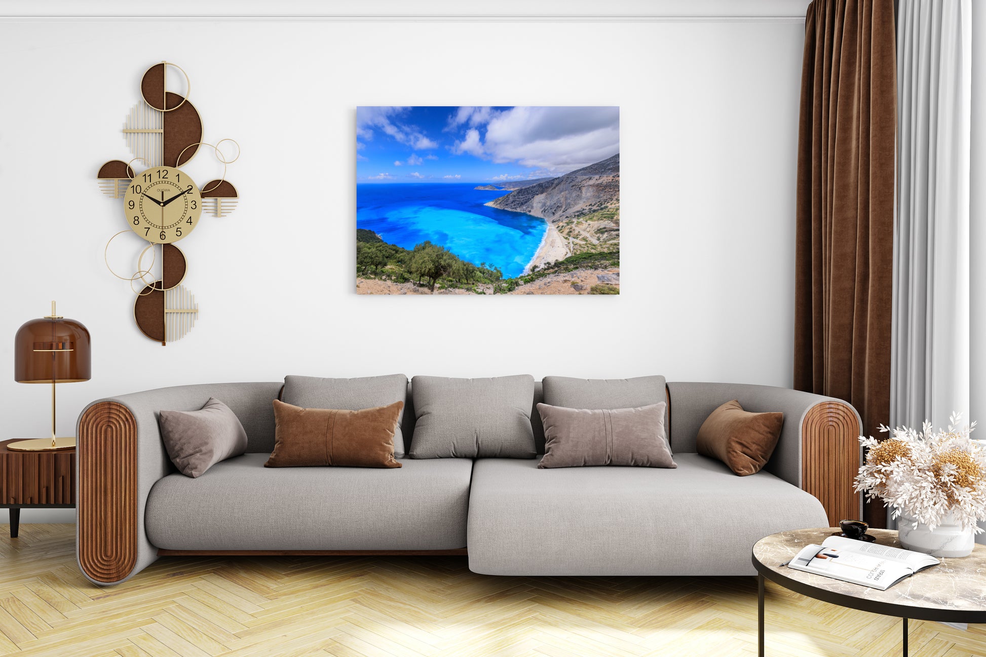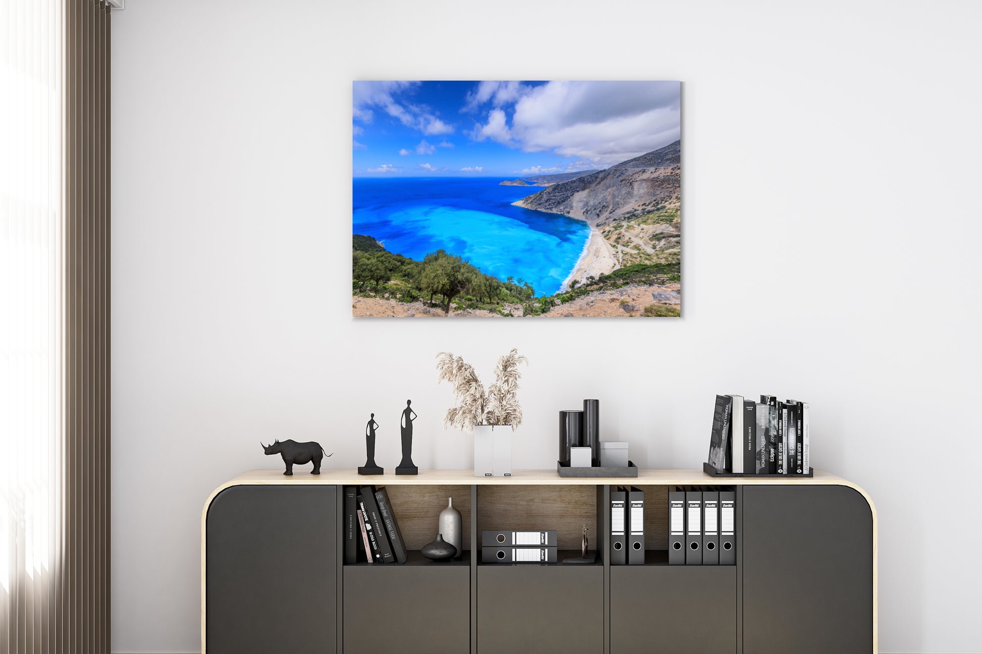 Myrtos Beach in Kefalonia regularly earns the title of one of the most beautiful beaches in the world, with its turquoise waters created by the unique reflection of sunlight off the light gravel. The high cliffs surrounding the beach give the place a unique, emotional character that captivates even the most demanding travelers. As you look at this image, you can almost hear the gentle sound of the waves and feel the warmth of a summer day warming the white stones. Turquoise and blue blend with the green of Mediterranean vegetation, creating a view that sparks the imagination. Lose yourself in this breathtaking scenery, which pulls you deeper with every passing moment, making you forget everything outside. Let this special moment stay with you forever, so you can return to the land of Greek dreams every day.