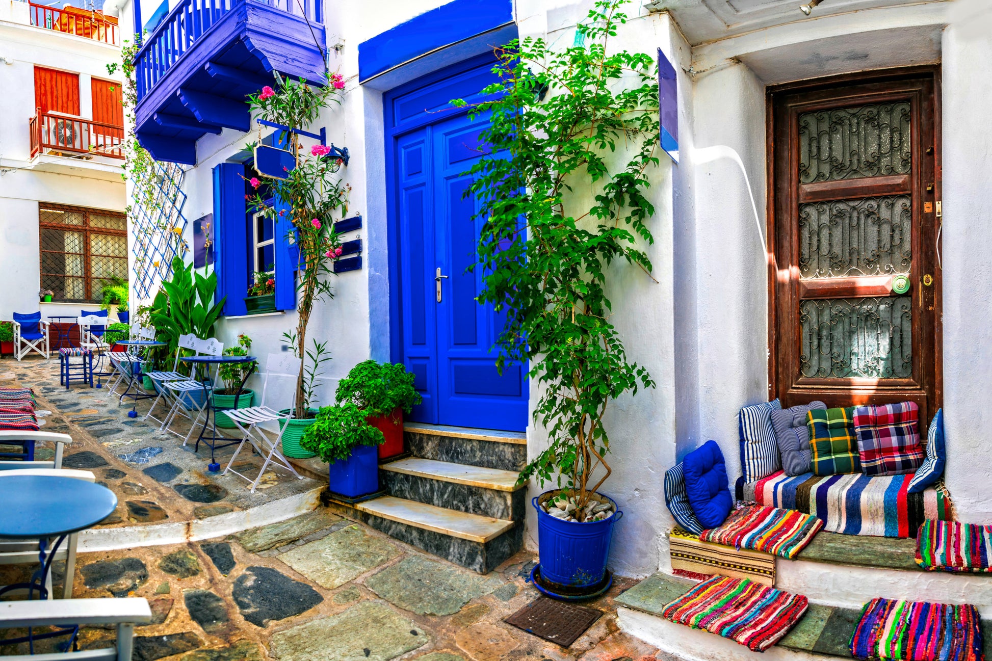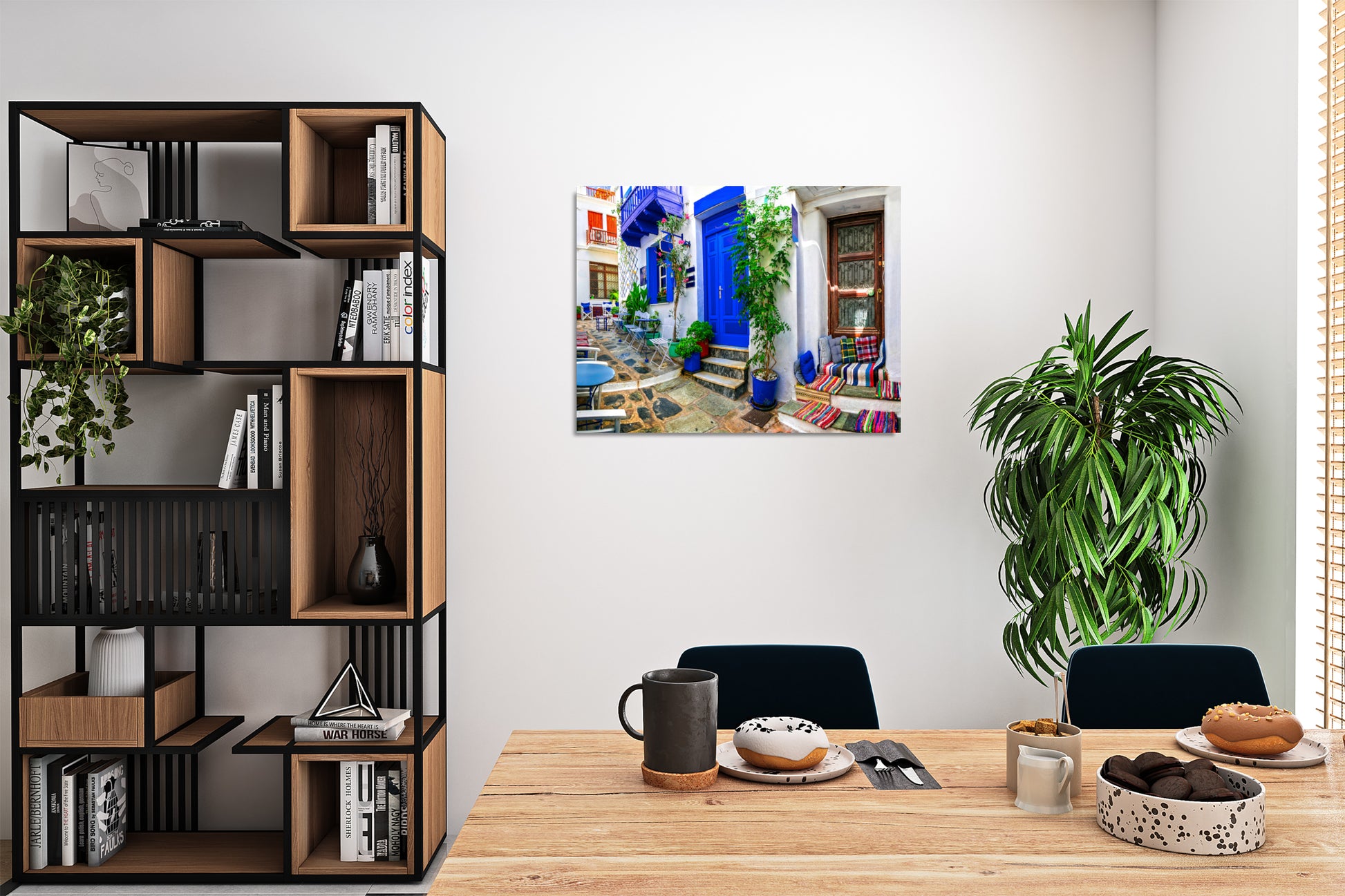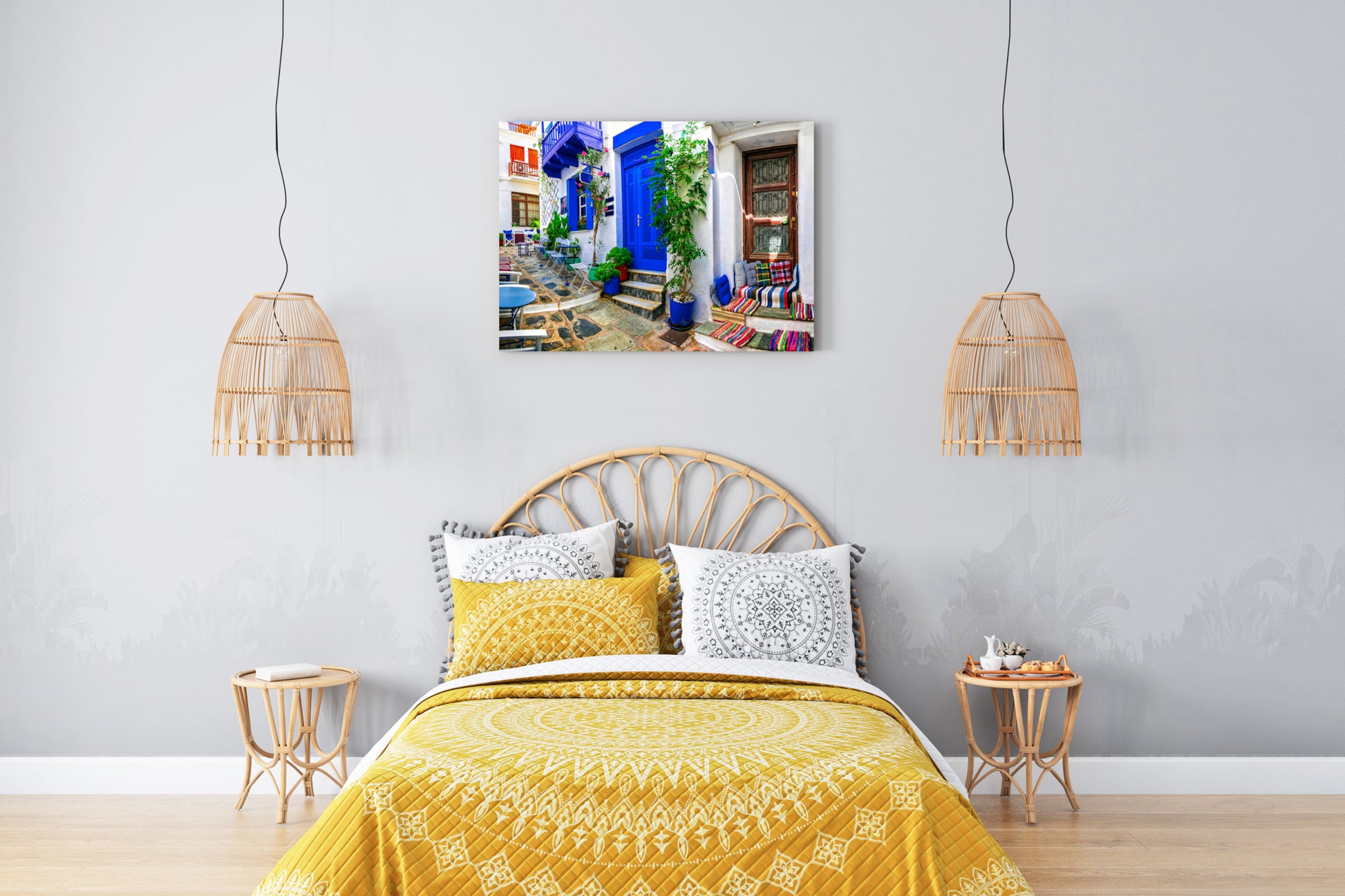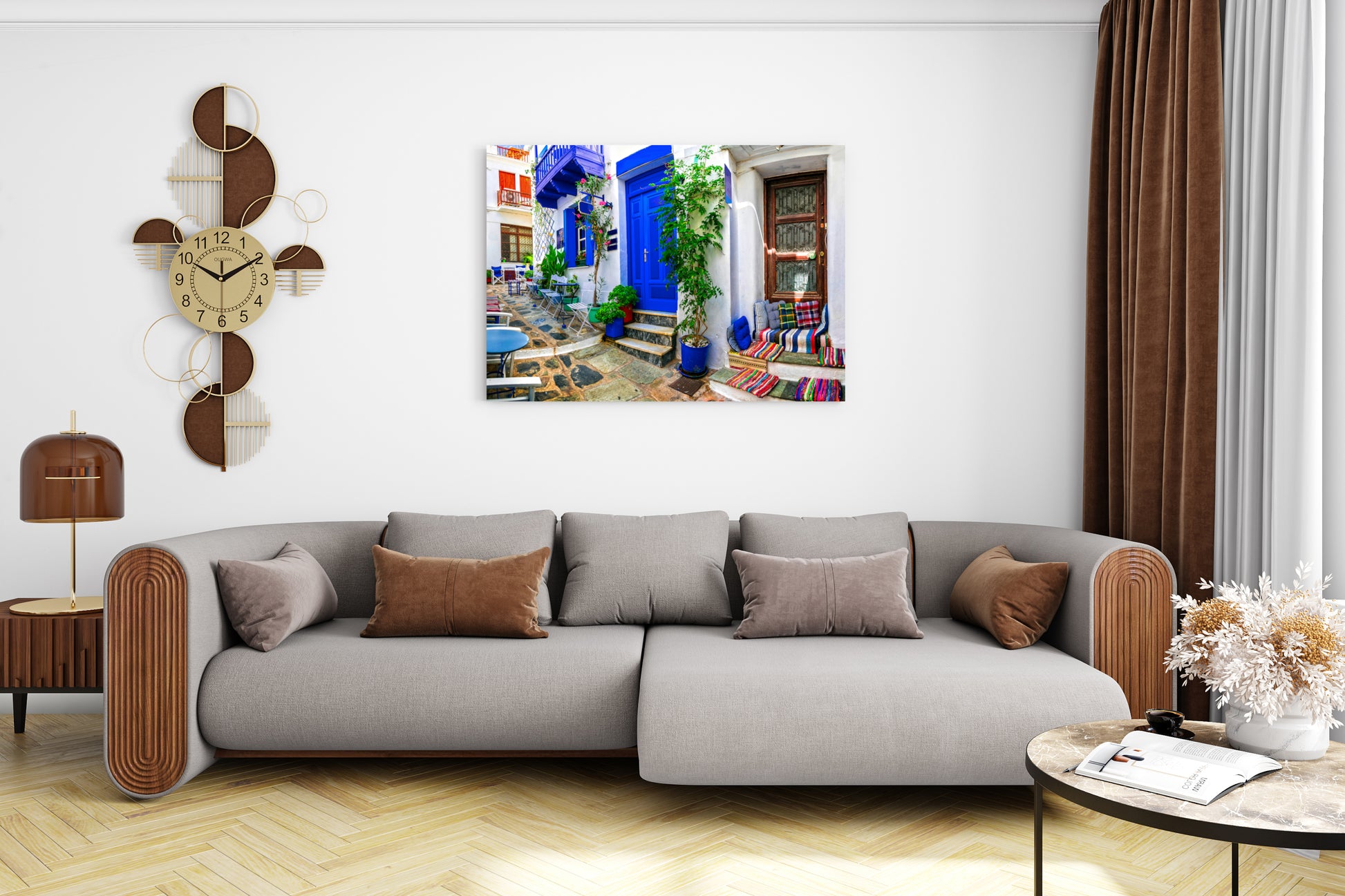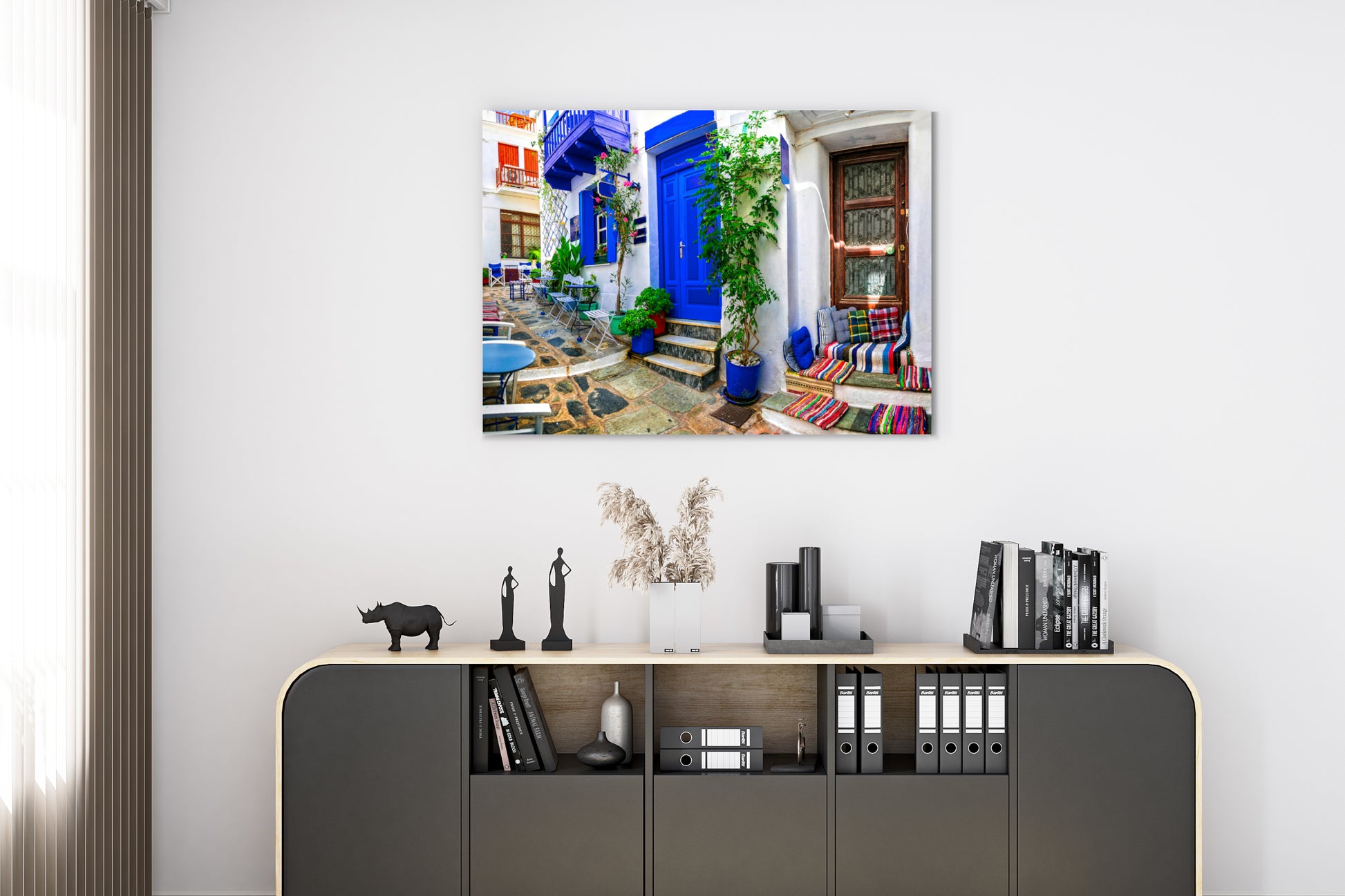 The winding streets of Skopelos, designed for natural ventilation, offer shade and shelter from the summer sun. These narrow paths, rich in history and tradition, weave through the island, their cobbled stones telling the stories of the past. The image captures the timeless charm of rustic buildings and the dance of light and shadow on stone walls, evoking a sense of warmth and nostalgia. Infuse your space with the unique character of this place, blending modern design with the spirit of local heritage, and let it capture attention from every angle.
