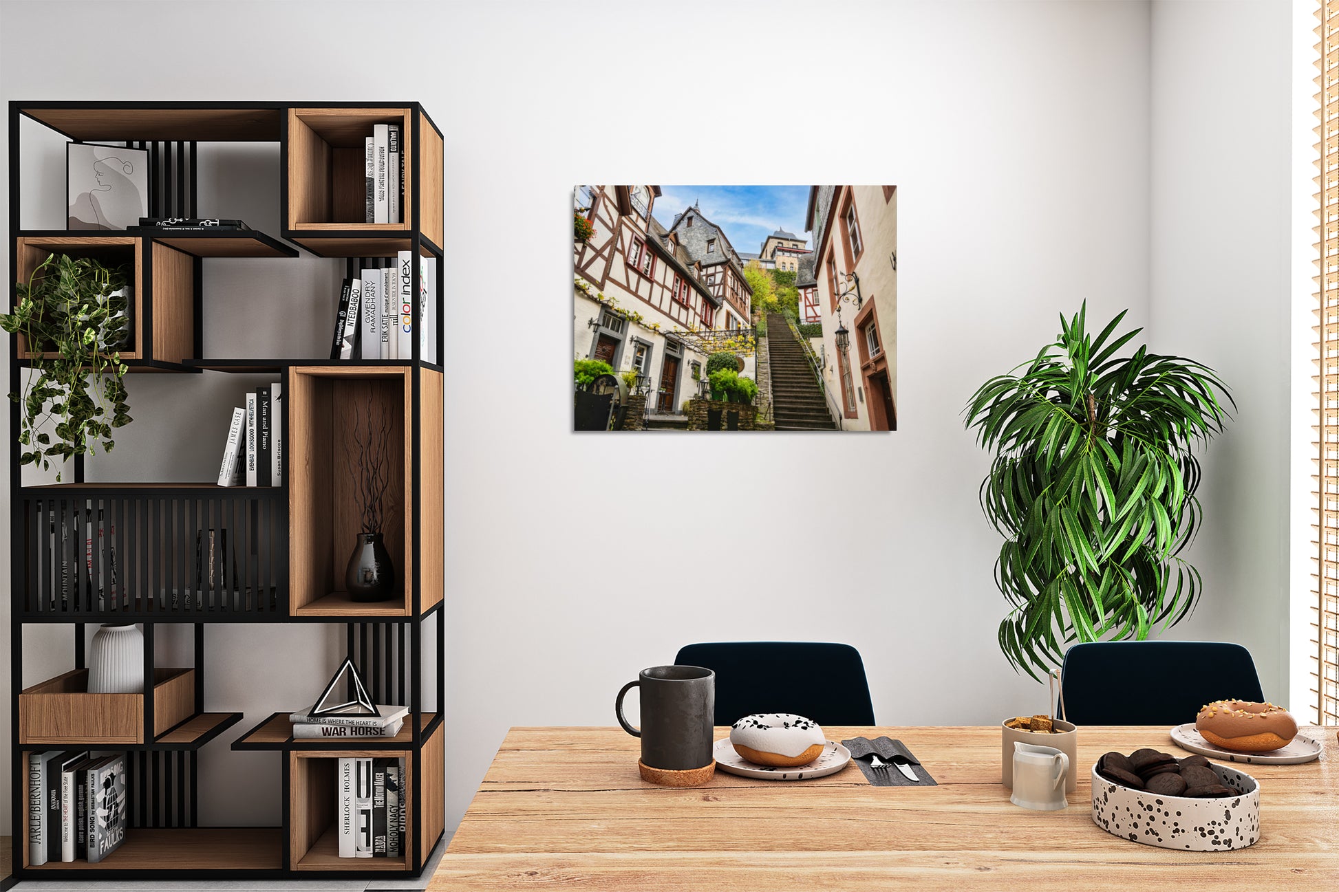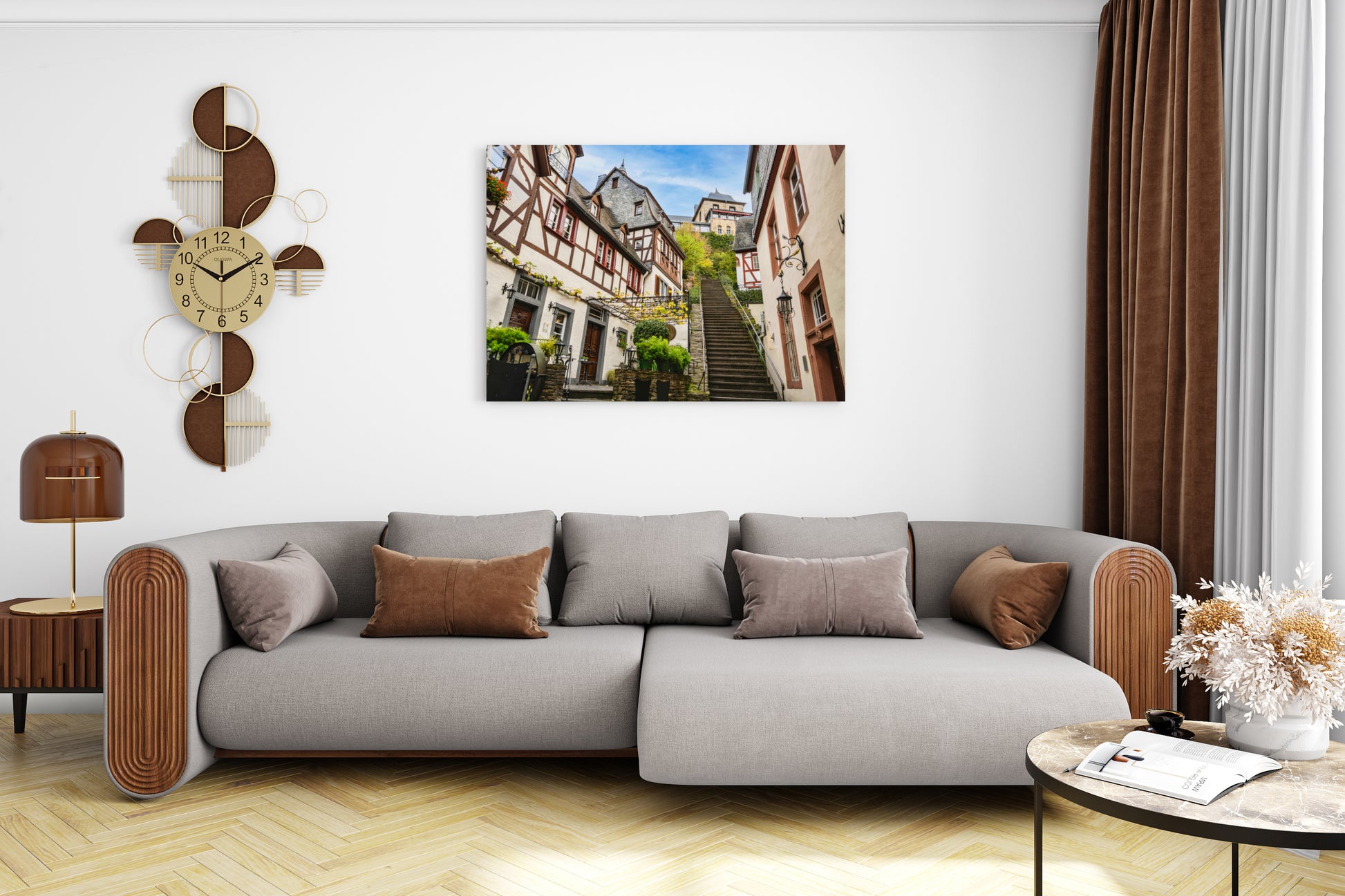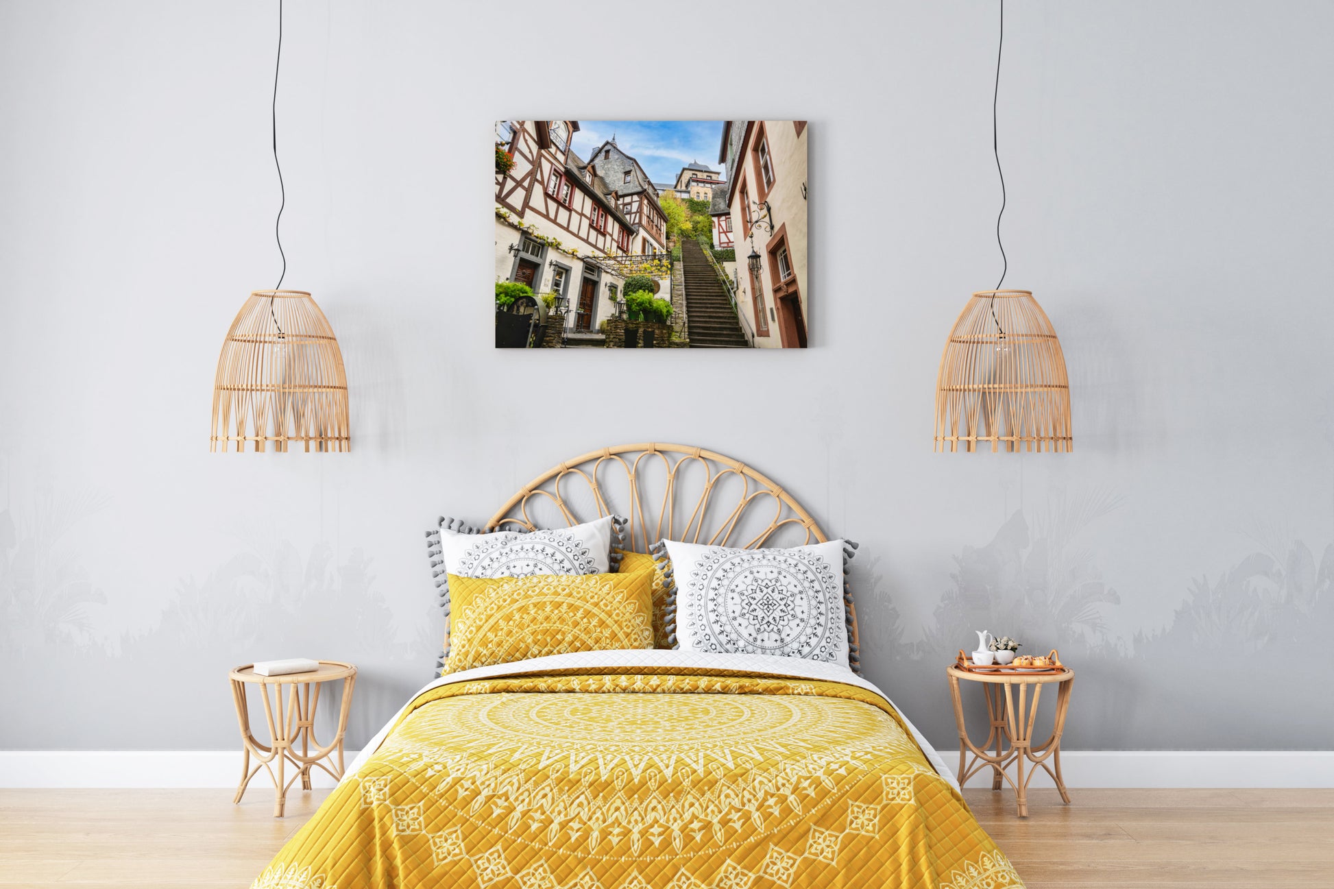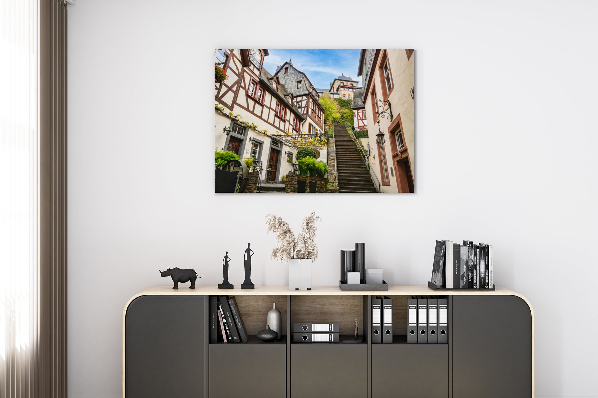 A charming alley in Beilstein winds its way uphill between half-timbered houses, whose characteristic wooden beams contrast with the white plaster. This architectural style, popular in many regions of Germany, emerged from the practical need to use locally available wood and infill materials. As a result, the structures were lighter and easier to build while providing good insulation in the variable Central European climate. Narrow, cobbled streets and romantic corners give the place a unique, historic charm, creating the impression of a journey through time. Let this picturesque scene from Beilstein bring a subtle touch of history and a romantic atmosphere into your interior.